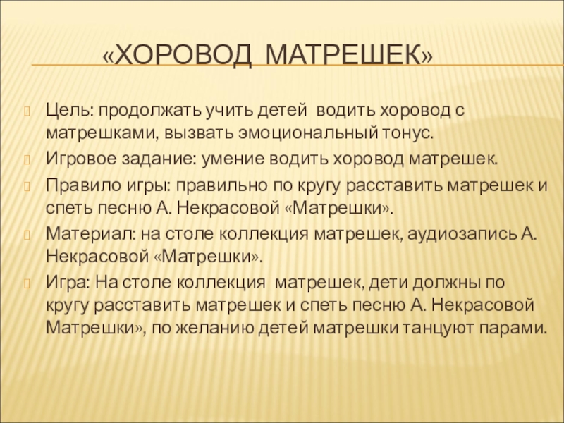 Правило игры: правильно по кругу расставить матрешек и спеть песню А. Некрасовой «Матрешки».