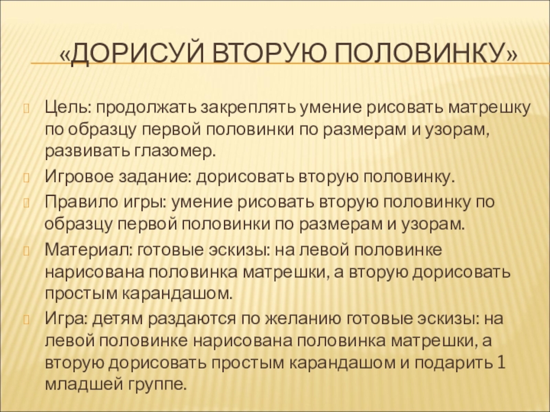 Игра: детям раздаются по желанию готовые эскизы: на левой половинке нарисована половинка матрешки, а вторую дорисовать простым карандашом и подарить 1 младшей группе.