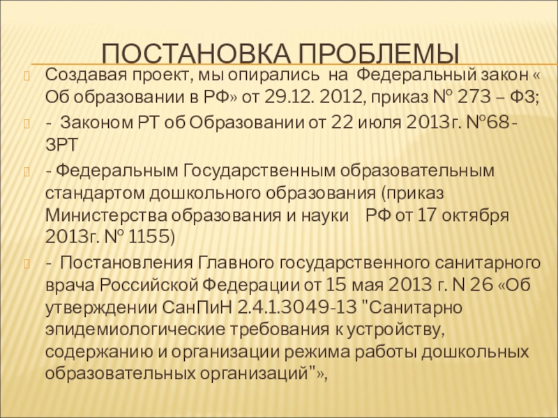 мы опирались на Федеральный закон « Об образовании в РФ» от 29.12. 2012, приказ № 273 – ФЗ;
