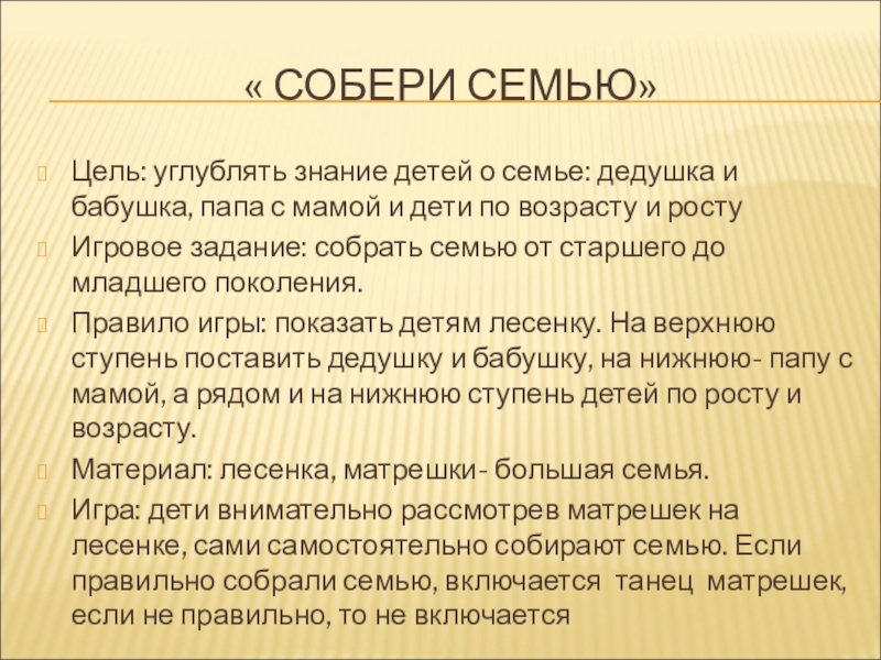 Правило игры: показать детям лесенку. На верхнюю ступень поставить дедушку и бабушку, на нижнюю- папу с мамой, а рядом и на нижнюю ступень детей по росту и возрасту.