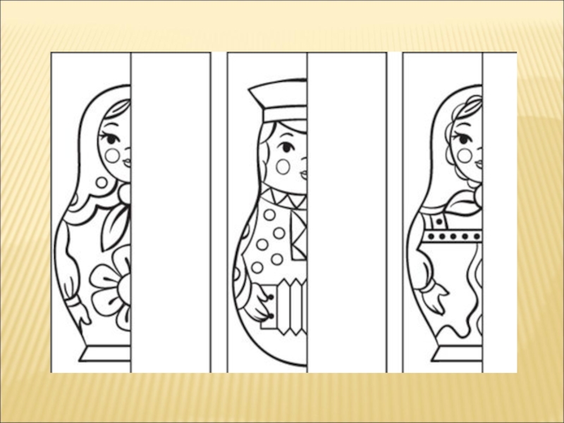 Материал: готовые эскизы: на левой половинке нарисована половинка матрешки, а вторую дорисовать простым карандашом.