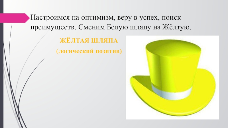 Слайд 15Настроимся на оптимизм, веру в успех, поиск преимуществ. Сменим Белую шляпу