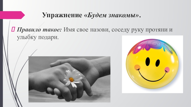 Правило такое: Имя свое назови, соседу руку протяни и улыбку