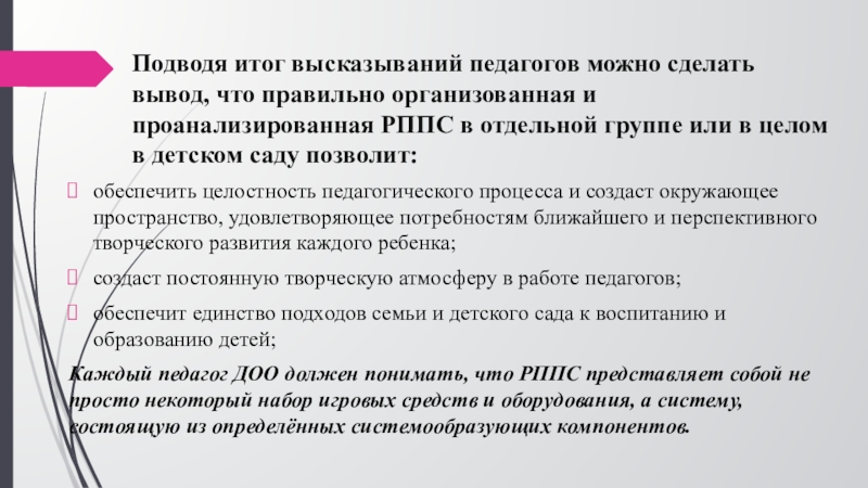 Каждый педагог ДОО должен понимать, что РППС представляет собой не просто некоторый набор игровых средств и оборудования, а систему, состоящую из определённых системообразующих компонентов.