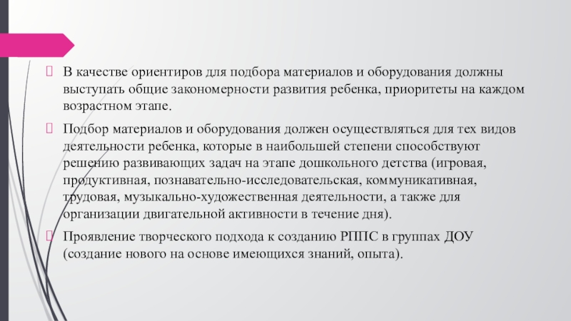 Подбор материалов и оборудования должен осуществляться для тех видов деятельности ребенка, которые в наибольшей степени способствуют решению развивающих задач на этапе дошкольного детства (игровая, продуктивная, познавательно-исследовательская, коммуникативная, трудовая, музыкально-художественная деятельности, а также для организации двигательной активности в течение дня).