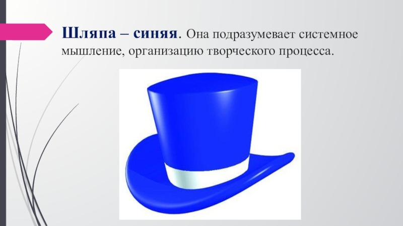 Слайд 21Шляпа – синяя. Она подразумевает системное мышление, организацию творческого процесса.