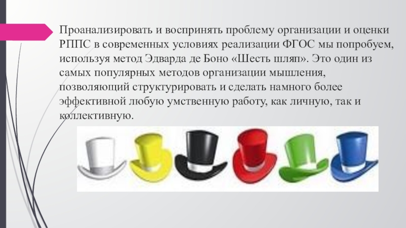 реализации ФГОС мы попробуем, используя метод Эдварда де Боно «Шесть шляп». Это один из самых популярных методов организации мышления, позволяющий структурировать и сделать намного более эффективной любую умственную работу, как личную, так и коллективную.