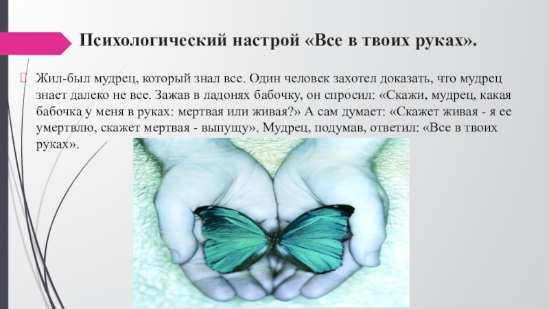 Жил-был мудрец, который знал все. Один человек захотел доказать, что мудрец знает далеко не все. Зажав в ладонях бабочку, он спросил: «Скажи, мудрец, какая бабочка у меня в руках: мертвая или живая?» А сам думает: «Скажет живая - я ее умертвлю, скажет мертвая - выпущу». Мудрец, подумав, ответил: «Все в твоих руках».