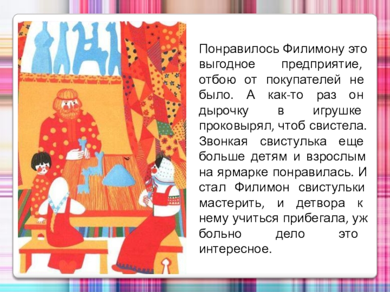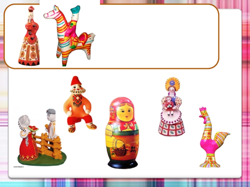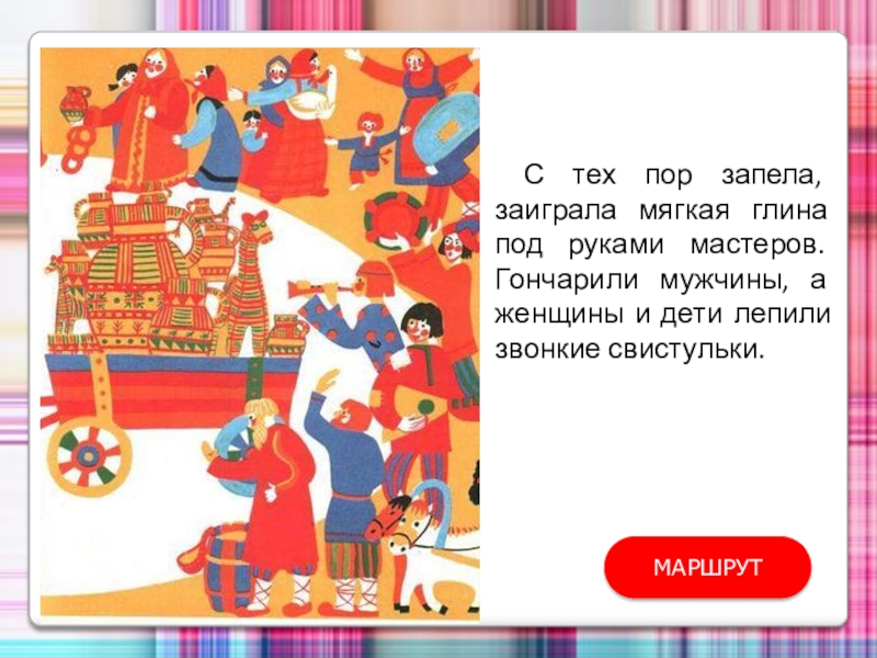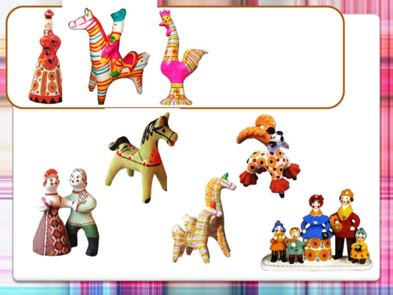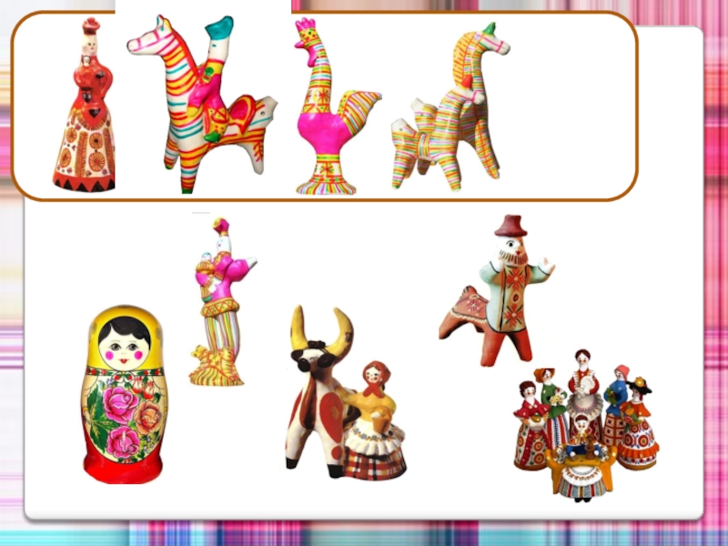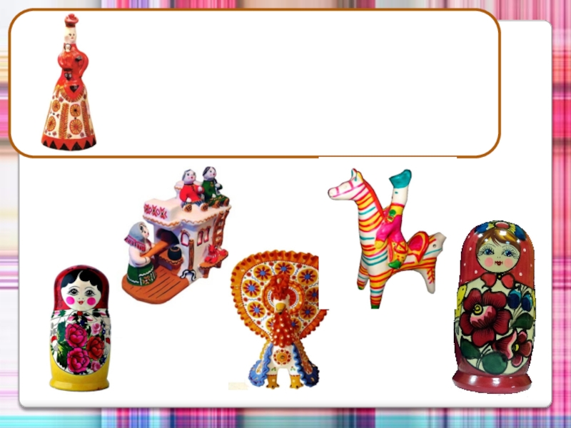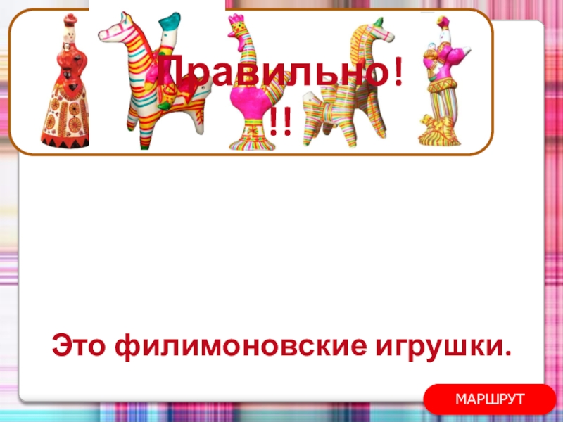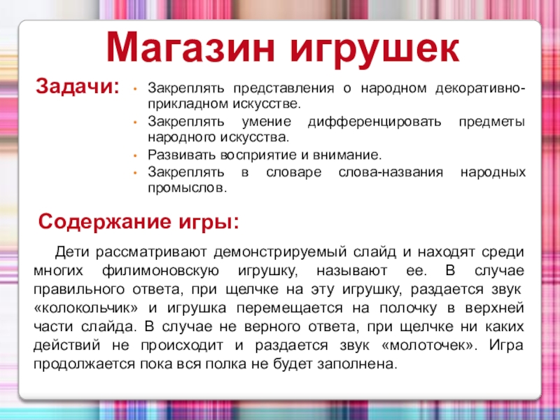 Дети рассматривают демонстрируемый слайд и находят среди многих филимоновскую игрушку, называют ее. В случае правильного ответа, при щелчке на эту игрушку, раздается звук «колокольчик» и игрушка перемещается на полочку в верхней части слайда. В случае не верного ответа, при щелчке ни каких действий не происходит и раздается звук «молоточек». Игра продолжается пока вся полка не будет заполнена.