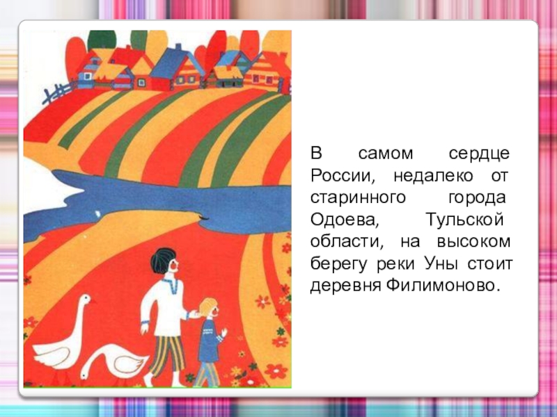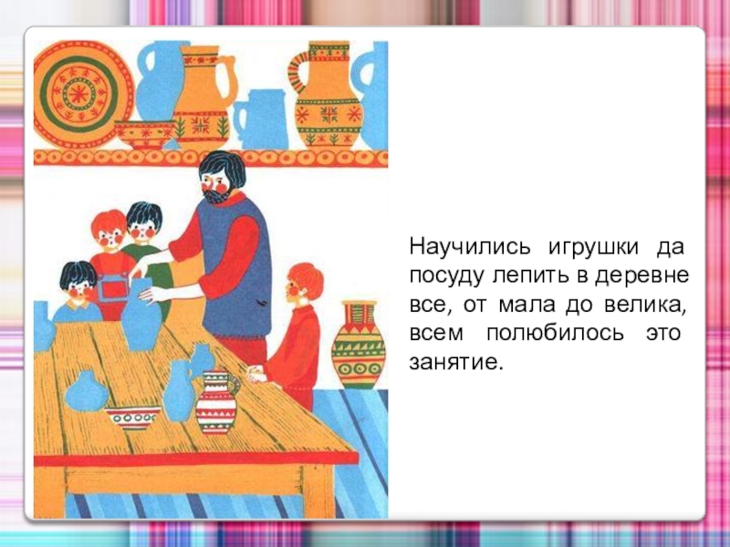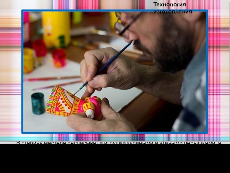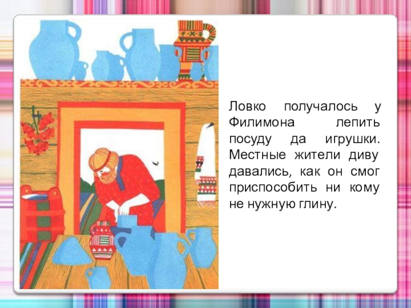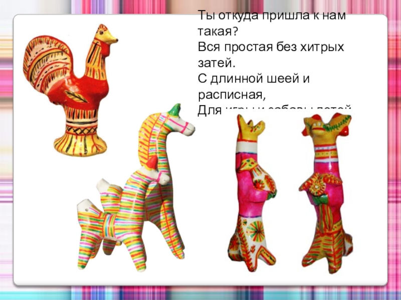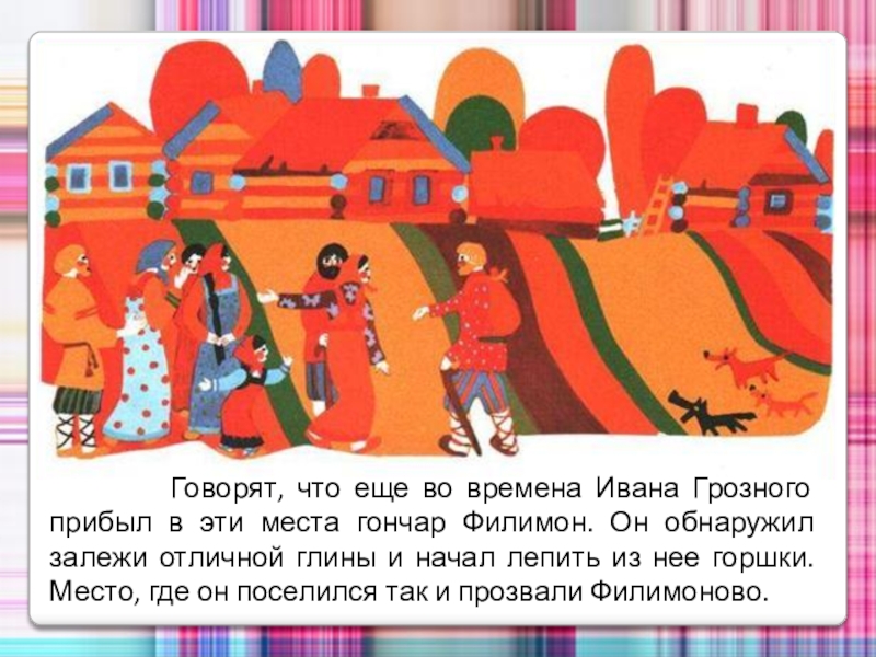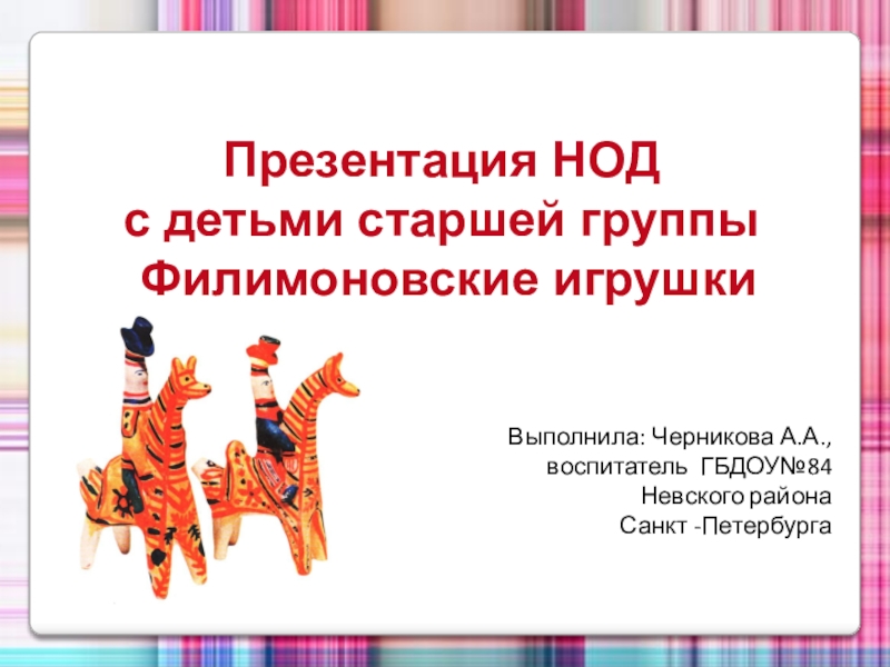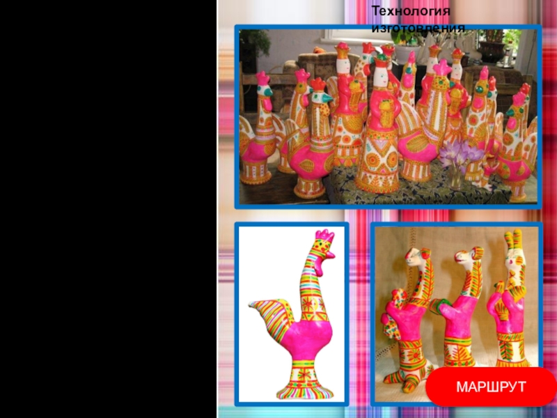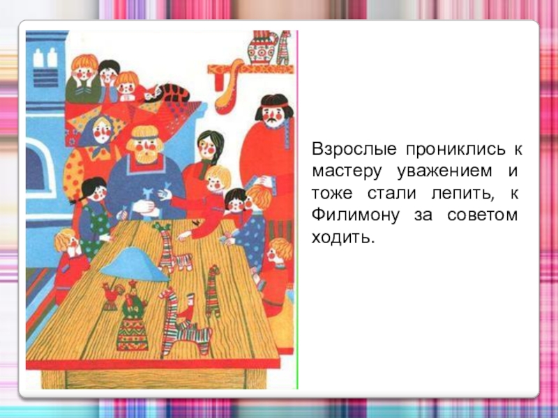 Дети рассматривают демонстрируемый слайд и находят среди многих филимоновскую игрушку, называют ее. В случае правильного ответа, при щелчке на эту игрушку, раздается звук «колокольчик» и игрушка перемещается на полочку в верхней части слайда. В случае не верного ответа, при щелчке ни каких действий не происходит и раздается звук «молоточек». Игра продолжается пока вся полка не будет заполнена.