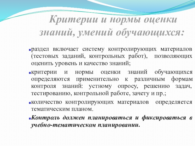 Слайд 23 Критерии и нормы оценки знаний, умений обучающихся: