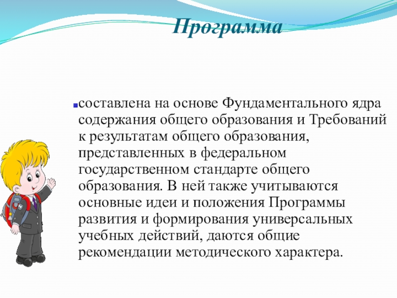 результатам общего образования, представленных в федеральном государственном стандарте общего образования. В ней также учитываются основные идеи и положения Программы развития и формирования универсальных учебных действий, даются общие рекомендации методического характера.