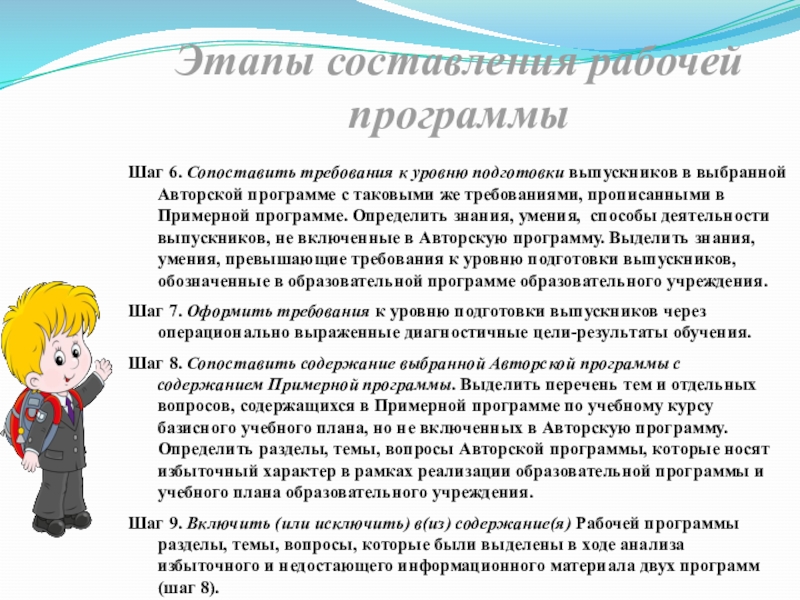 Шаг 9. Включить (или исключить) в(из) содержание(я) Рабочей программы разделы, темы, вопросы, которые были выделены в ходе анализа избыточного и недостающего информационного материала двух программ (шаг 8).
