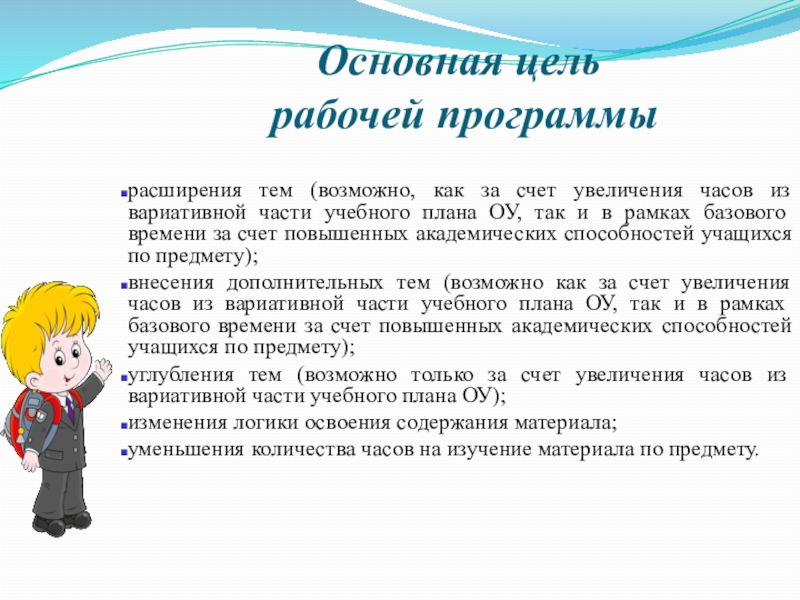 внесения дополнительных тем (возможно как за счет увеличения часов из вариативной части учебного плана ОУ, так и в рамках базового времени за счет повышенных академических способностей учащихся по предмету);