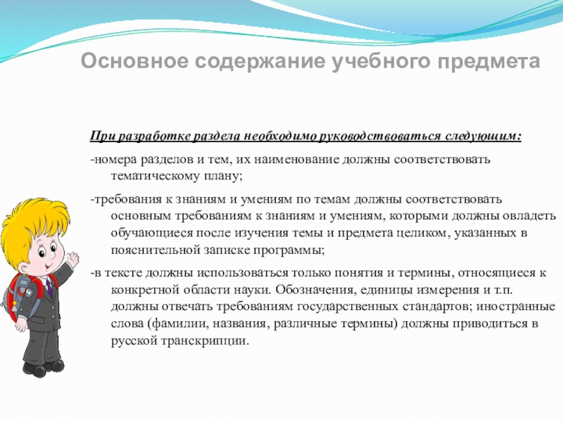 -требования к знаниям и умениям по темам должны соответствовать основным требованиям к знаниям и умениям, которыми должны овладеть обучающиеся после изучения темы и предмета целиком, указанных в пояснительной записке программы;