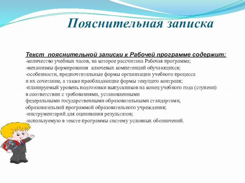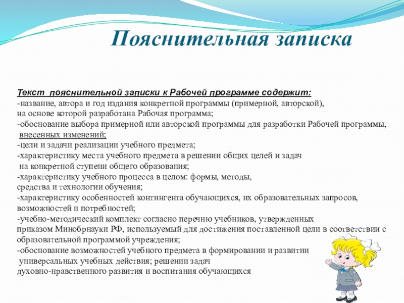 Слайд 16Текст пояснительной записки к Рабочей программе содержит: