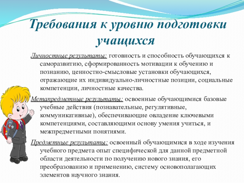 Метапредметные результаты: освоенные обучающимися базовые учебные действия (познавательные, регулятивные, коммуникативные), обеспечивающие овладение ключевыми компетенциями, составляющими основу умения учиться, и межпредметными понятиями.