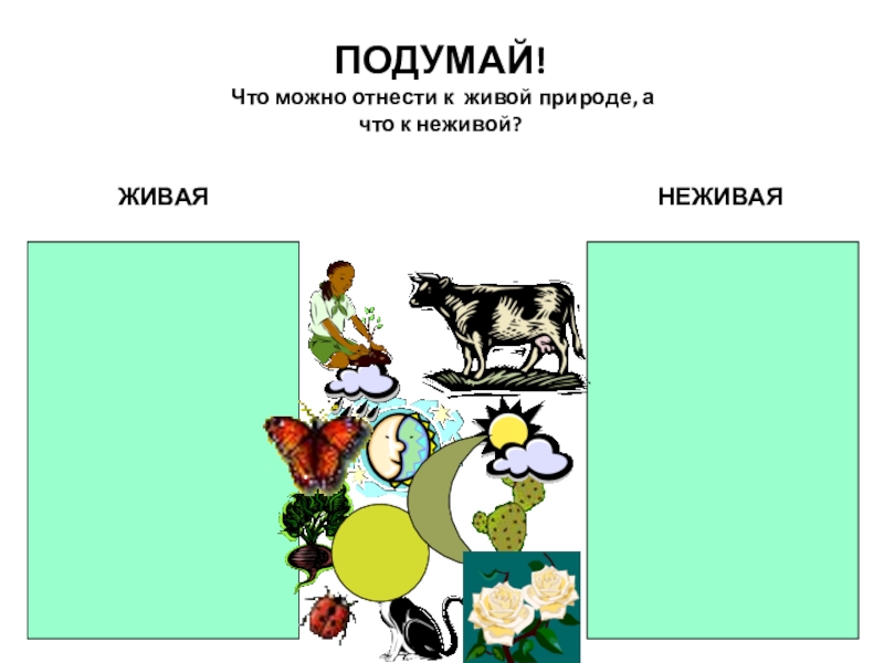 ПОДУМАЙ!Что можно отнести к живой природе, а что к неживой?ЖИВАЯНЕЖИВАЯ