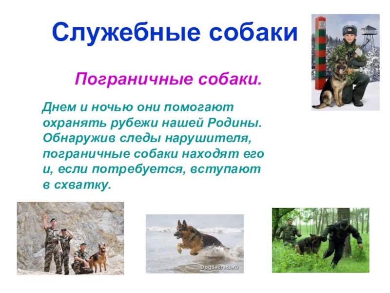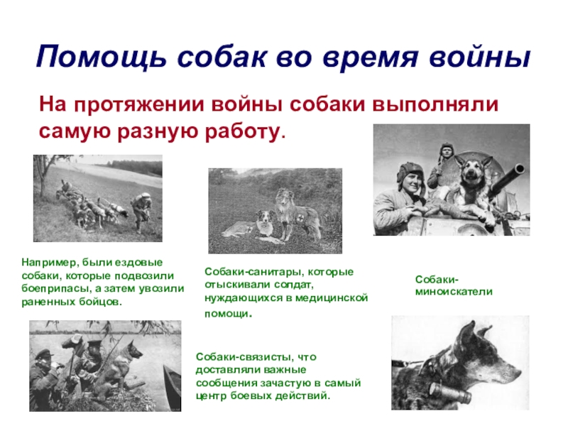 Например, были ездовые собаки, которые подвозили боеприпасы, а затем увозили раненных бойцов.