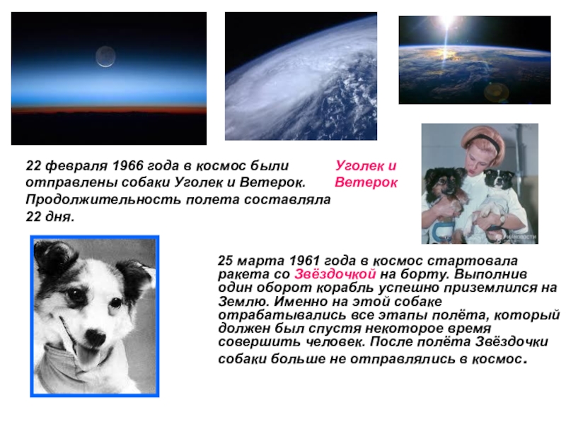 22 февраля 1966 года в космос были отправлены собаки Уголек и Ветерок. Продолжительность полета составляла 22 дня.