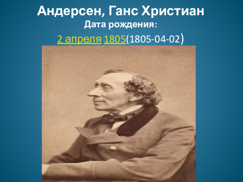 Слайд 2Андерсен, Ганс Христиан Дата рождения: 2 апреля 1805(1805-04-02)