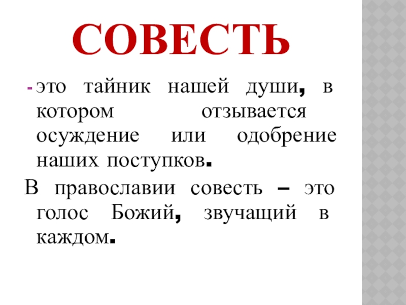 Совестьэто тайник нашей души, в котором отзывается осуждение или одобрение наших поступков. В православии совесть – это