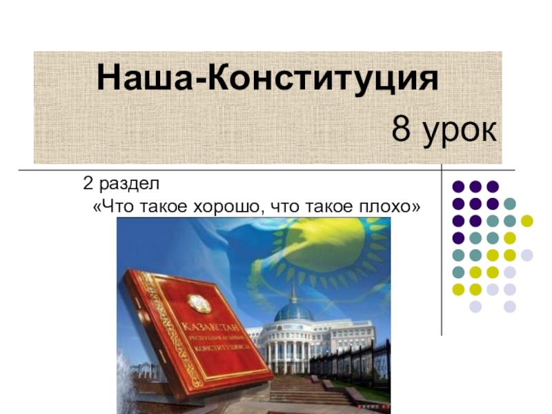 новая Конституция Республики Казахстан - основной закон страны. Все государственные документы принимаются на её основе. Даже самым малым народам гарантируются все права. Великий бий казахского народа Толе би призывал народ к единству: «Если народ силён единством, братской солидарностью, то он станет образцом для последующих поколений».