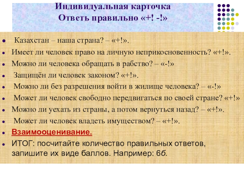 ИТОГ: посчитайте количество правильных ответов, запишите их виде баллов. Например: 6б.
