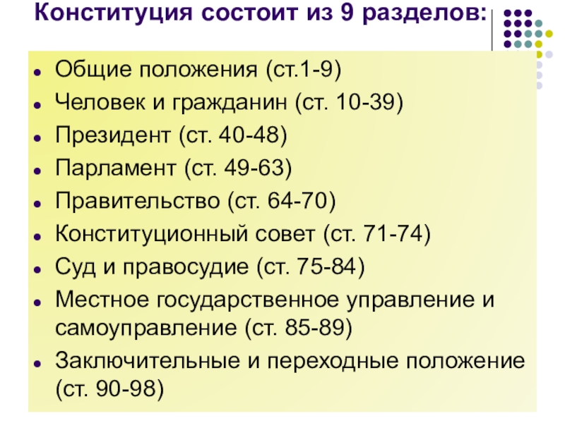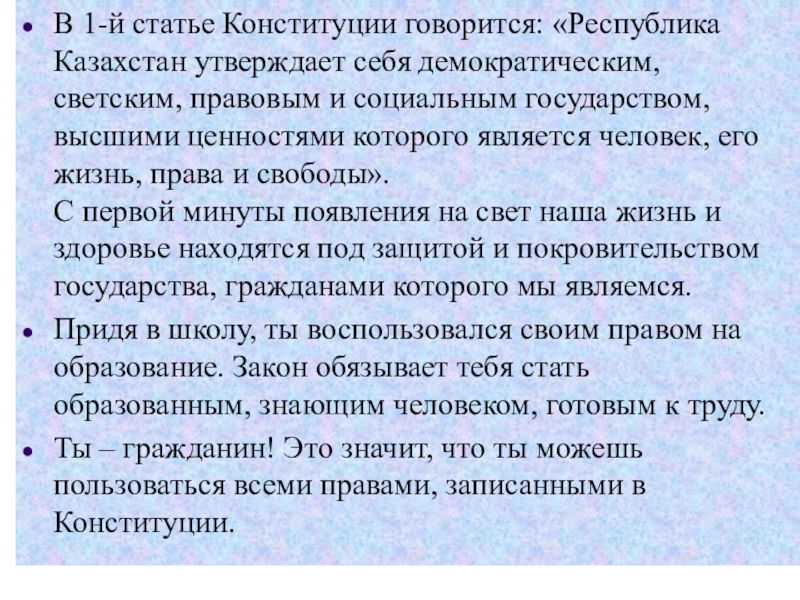 Слайд 14В 1-й статье Конституции говорится: «Республика Казахстан утверждает себя демократическим, светским,