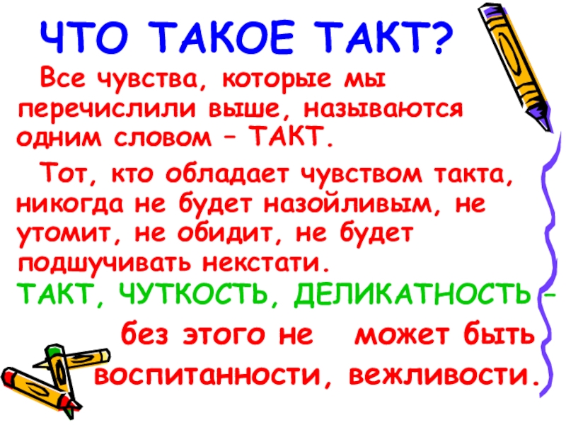 Тот, кто обладает чувством такта, никогда не будет назойливым, не утомит, не обидит, не будет подшучивать некстати. ТАКТ, ЧУТКОСТЬ, ДЕЛИКАТНОСТЬ –