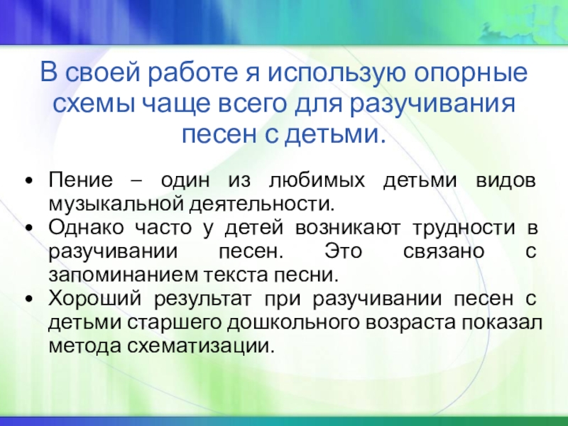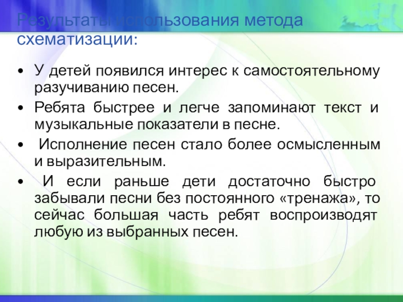 Хороший результат при разучивании песен с детьми старшего дошкольного возраста показал метода схематизации.