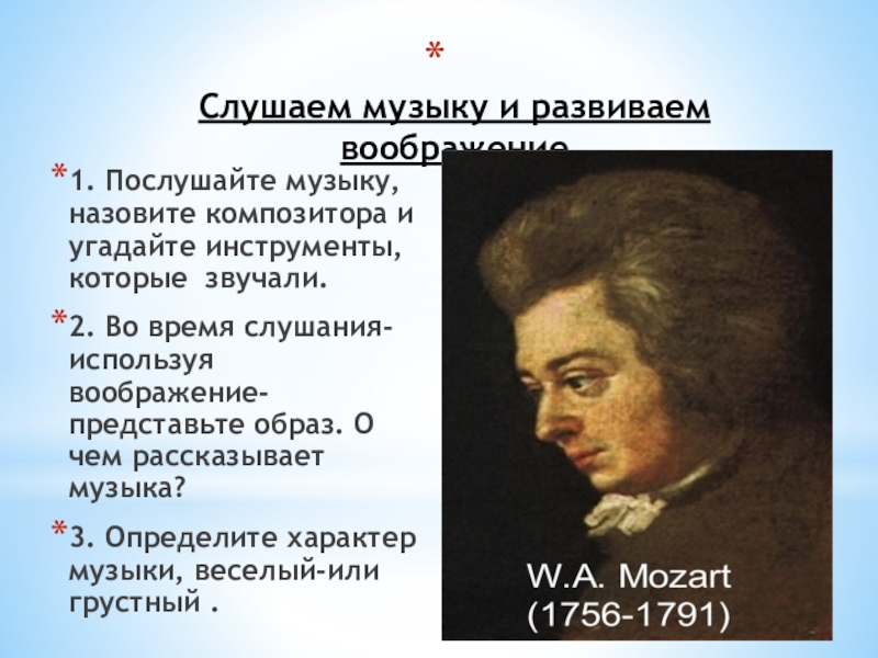 Слушаем музыку и развиваем воображение .1. Послушайте музыку, назовите композитора и угадайте инструменты, которые звучали.2. Во