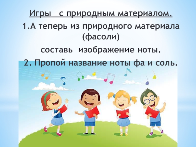 Игры  с природным материалом.1.А теперь из природного материала(фасоли)составь изображение ноты. 2. Пропой название ноты фа и