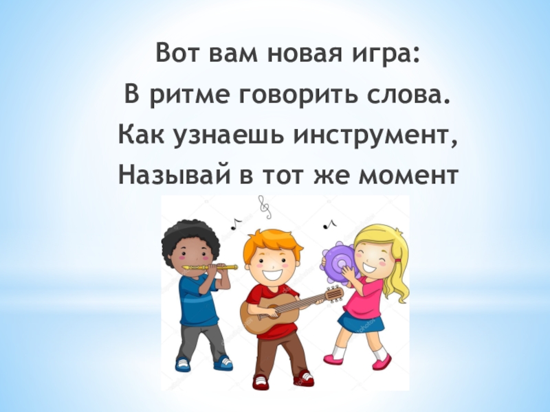Вот вам новая игра:В ритме говорить слова.Как узнаешь инструмент,Называй в тот же момент