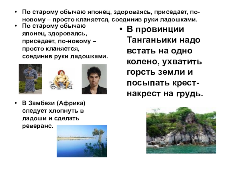 По старому обычаю японец, здороваясь, приседает, по-новому – просто кланяется, соединив руки ладошками.