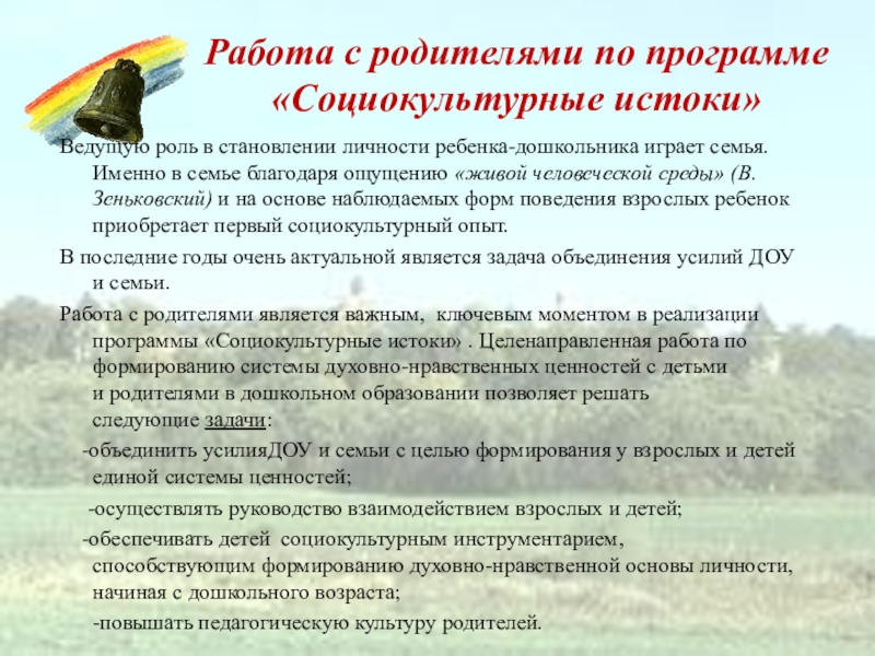 На решение этих задач направлена программа «Социокультурные истоки», которая представляет собой апробированную образовательно-воспитательную дидактическую систему и оригинальную педагогическую технологию.