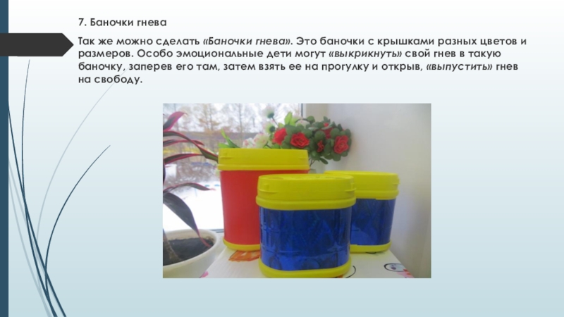 крышками разных цветов и размеров. Особо эмоциональные дети могут «выкрикнуть» свой гнев в такую баночку, заперев его там, затем взять ее на прогулку и открыв, «выпустить» гнев на свободу.