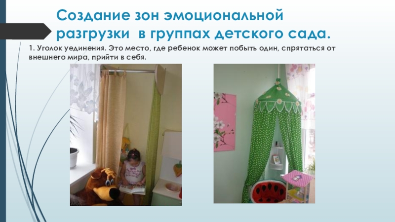 Слайд 23Создание зон эмоциональной разгрузки в группах детского сада.