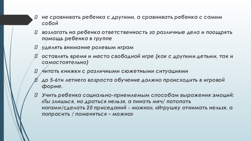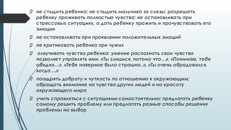 Слайд 13не стыдить ребенка; не стыдить мальчика за слезы; разрешать ребенку проживать