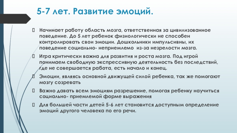До 5 лет ребенок физиологически не способен контролировать свои эмоции. Дошкольники импульсивны, их поведение социально- неприемлемо из-за незрелости мозга.