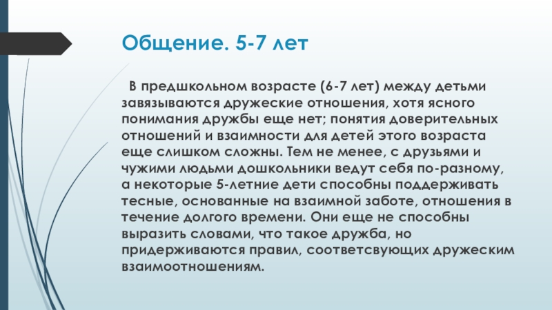 детьми завязываются дружеские отношения, хотя ясного понимания дружбы еще нет; понятия доверительных отношений и взаимности для детей этого возраста еще слишком сложны. Тем не менее, с друзьями и чужими людьми дошкольники ведут себя по-разному, а некоторые 5-летние дети способны поддерживать тесные, основанные на взаимной заботе, отношения в течение долгого времени. Они еще не способны выразить словами, что такое дружба, но придерживаются правил, соответсвующих дружеским взаимоотношениям.