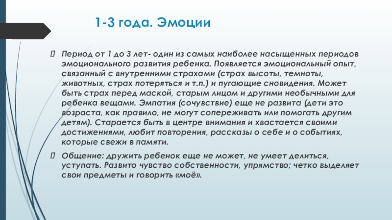 наиболее насыщенных периодов эмоционального развития ребенка. Появляется эмоциональный опыт, связанный с внутренними страхами (страх высоты, темноты, животных, страх потеряться и т.п.) и пугающие сновидения. Может быть страх перед маской, старым лицом и другими необычными для ребенка вещами. Эмпатия (сочувствие) еще не развита (дети это возраста, как правило, не могут сопереживать или помогать другим детям). Старается быть в центре внимания и хвастается своими достижениями, любит повторения, рассказы о себе и о событиях, которые свежи в памяти.