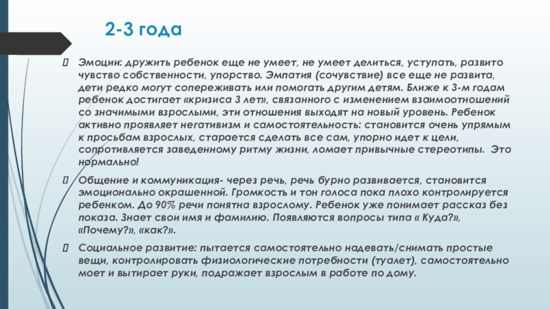 развито чувство собственности, упорство. Эмпатия (сочувствие) все еще не развита, дети редко могут сопереживать или помогать другим детям. Ближе к 3-м годам ребенок достигает «кризиса 3 лет», связанного с изменением взаимоотношений со значимыми взрослыми, эти отношения выходят на новый уровень. Ребенок активно проявляет негативизм и самостоятельность: становится очень упрямым к просьбам взрослых, старается сделать все сам, упорно идет к цели, сопротивляется заведенному ритму жизни, ломает привычные стереотипы. Это нормально!