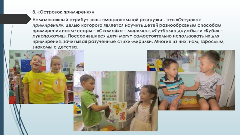 целью которого является научить детей разнообразным способам примирения после ссоры – «Скамейка – мирилка», «Футболка дружбы» и «Кубик – рукопожатия». Поссорившиеся дети могут самостоятельно использовать их для примирения, зачитывая разученные стихи-мирилки. Многие из них, нам, взрослым, знакомы с детства.