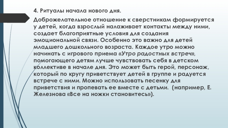 когда взрослый налаживает контакты между ними, создает благоприятные условия для создания эмоциональной связи. Особенно это важно для детей младшего дошкольного возраста. Каждое утро можно начинать с игрового приема «Утро радостных встреч», помогающего детям лучше чувствовать себя в детском коллективе в начале дня. Это может быть герой, персонаж, который по кругу приветствует детей в группе и радуется встрече с ними. Можно использовать песенку для приветствия и пропевать ее вместе с детьми. (например, Е.Железнова «Все на ножки становитесь»).