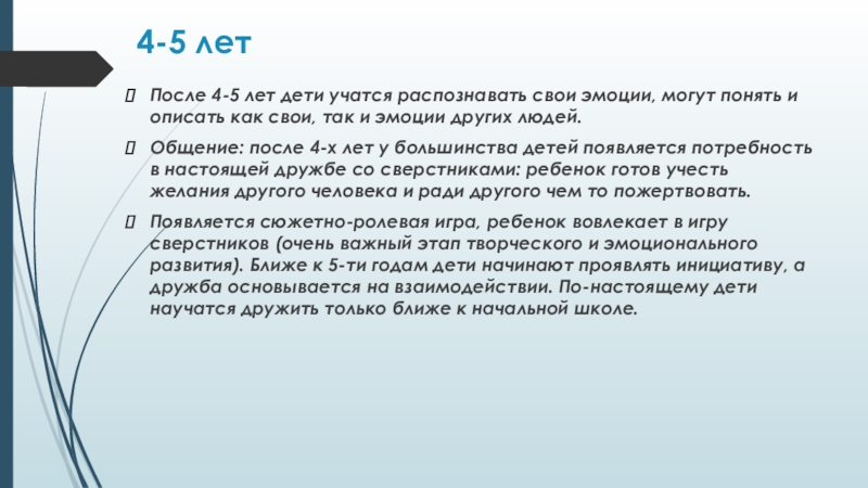 Общение: после 4-х лет у большинства детей появляется потребность в настоящей дружбе со сверстниками: ребенок готов учесть желания другого человека и ради другого чем то пожертвовать.