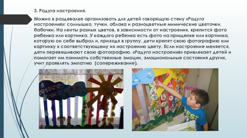 настроения»: солнышко, тучки, облака и разноцветные мимические цветочки, бабочки. На ленты разных цветов, в зависимости от настроения, крепится фото ребенка или картинка. У каждого ребенка есть фото на прищепке или картинка, которую он себе выбрал и, приходя в группу, дети крепят свою фотографию или картинку к соответствующему их настроению цвету. Если настроение меняется, дети перевешивают свою фотографию. «Радуга настроения» привлекает детей и помогает им понимать собственные эмоции, эмоциональные состояния других, учит проявлять эмпатию (сопереживание).