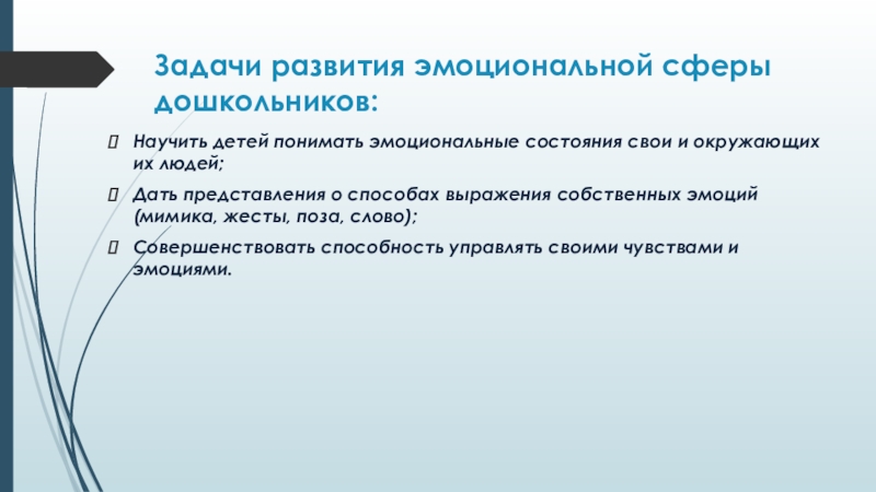 Слайд 18Задачи развития эмоциональной сферы дошкольников: