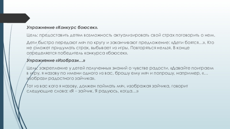 Дети быстро передают мяч по кругу и заканчивают предложение: «Дети боятся…». Кто не сможет придумать страх, выбывает из игры. Повторяться нельзя. В конце определяется победитель конкурса «боюсек».