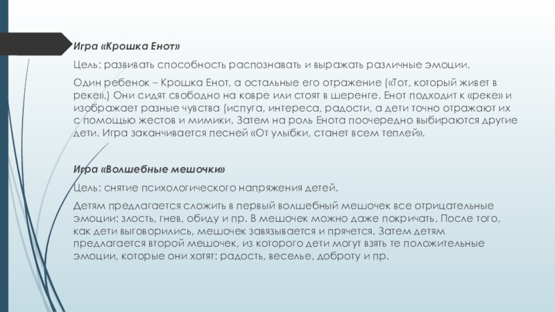 – Крошка Енот, а остальные его отражение («Тот, который живет в реке».) Они сидят свободно на ковре или стоят в шеренге. Енот подходит к «реке» и изображает разные чувства (испуга, интереса, радости, а дети точно отражают их с помощью жестов и мимики. Затем на роль Енота поочередно выбираются другие дети. Игра заканчивается песней «От улыбки, станет всем теплей».